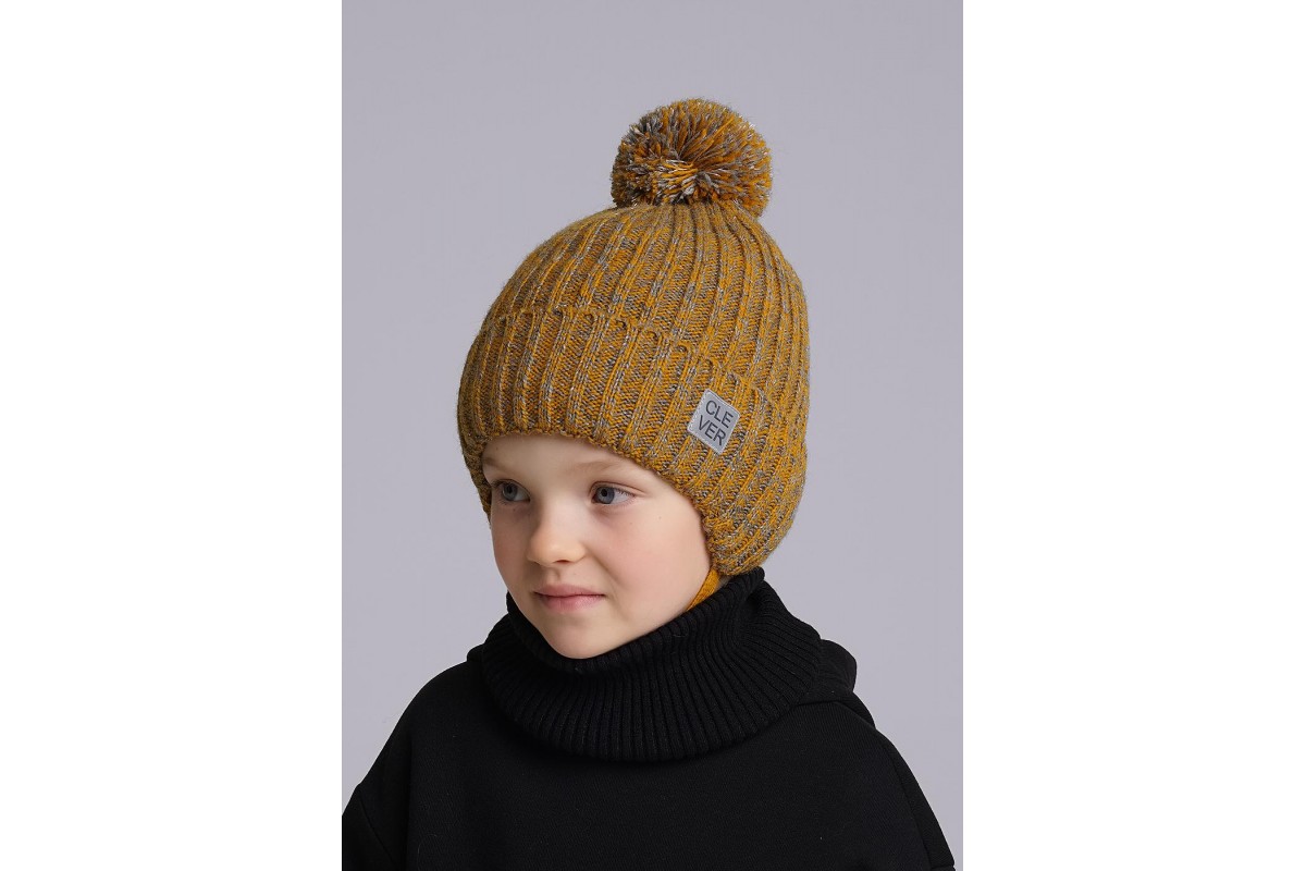 Детская шапка на завязках с отворотом, горчичный/меланж серый